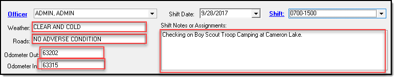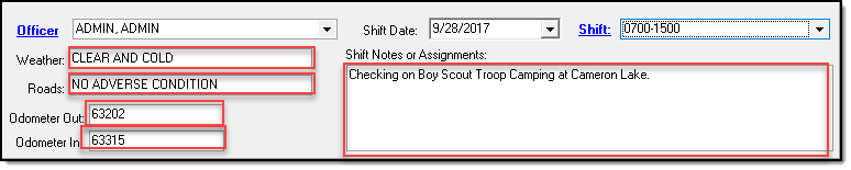 Shift Notes or Assignments by typing data directly into the appropriate boxes. Entries for Weather and Roads are limited to 20 characters and Odometer entries are limited to 7 characters. There is no character limit to Shift Notes or Assignment entries.