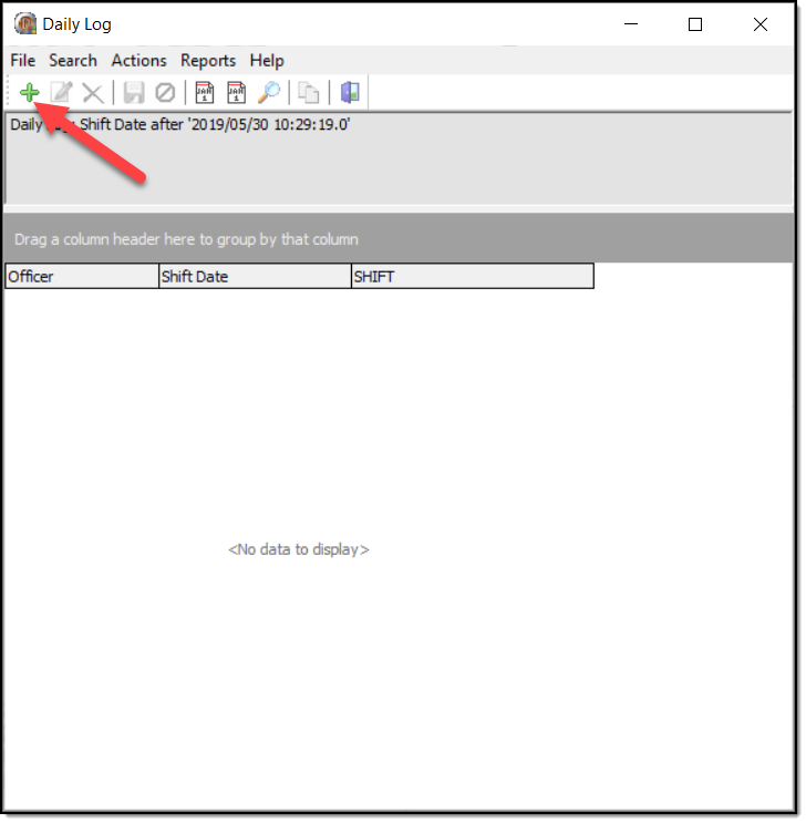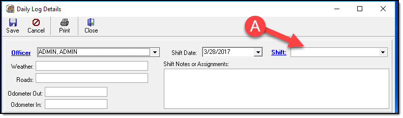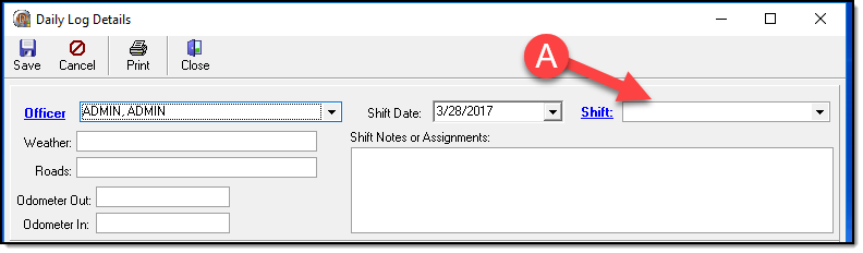 2. A Daily Log Details window will open that automatically contains the logged in officer’s name and the current date. The officer’s assigned shift (A) can be selected from the corresponding drop down box to the right of the Shift date field.