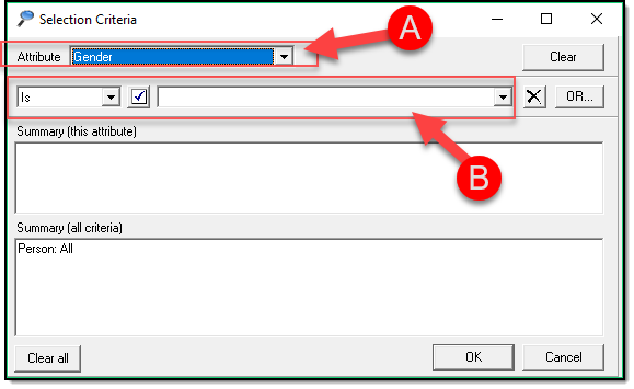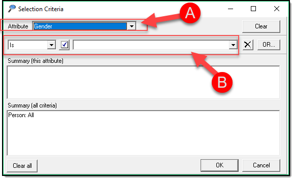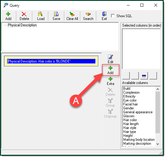 - Add Extra Criteria by clicking the Add Extra button (A) and repeating steps 2-3. This adds an And between search criteria.