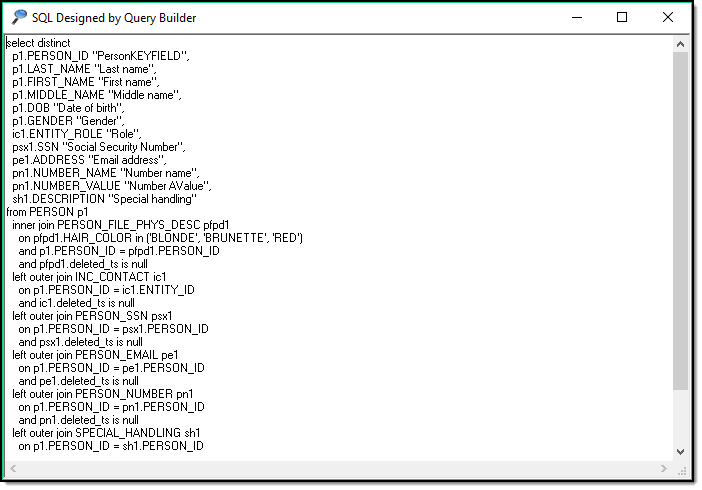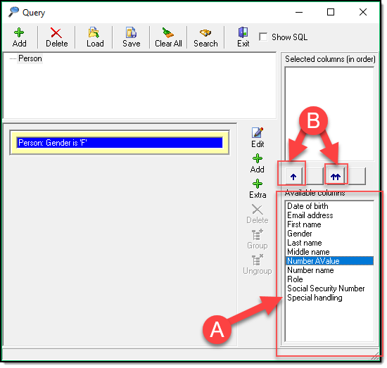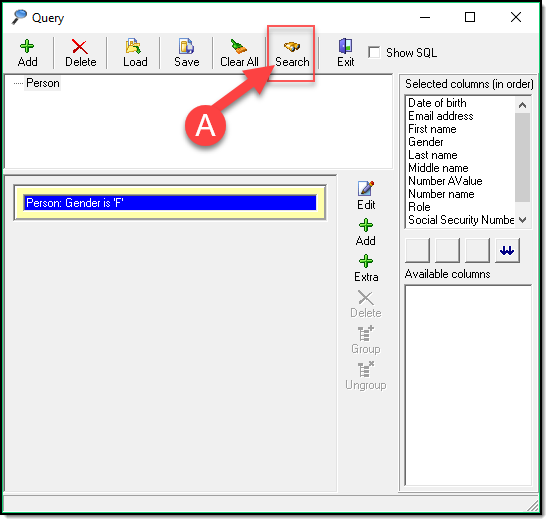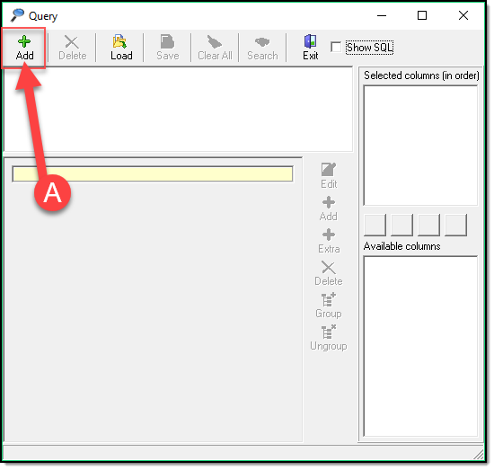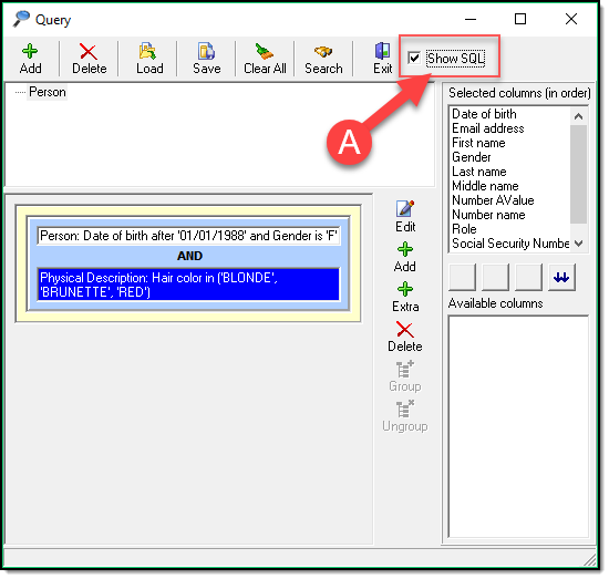 The “Show SQL” (A) check box is for use by advanced users only. This generates a SQL statement for your given query.