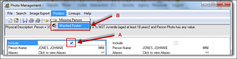 1. From the search results, select the check box of the photo you wish to include on the poster (A), and then select the “Wanted Poster” button from the Posters drop down list (B).