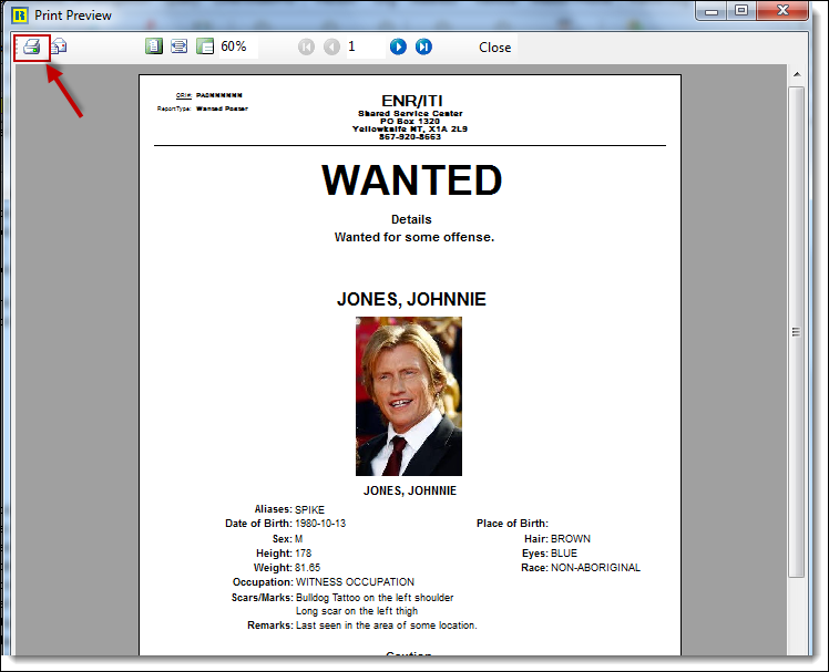 6. From the Print Preview window, click the “Print” button to print the Wanted Person poster.