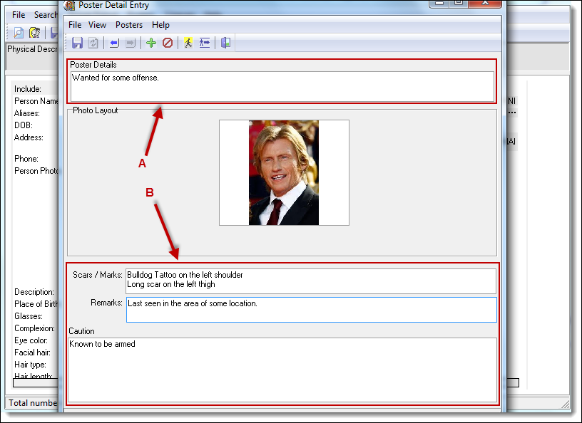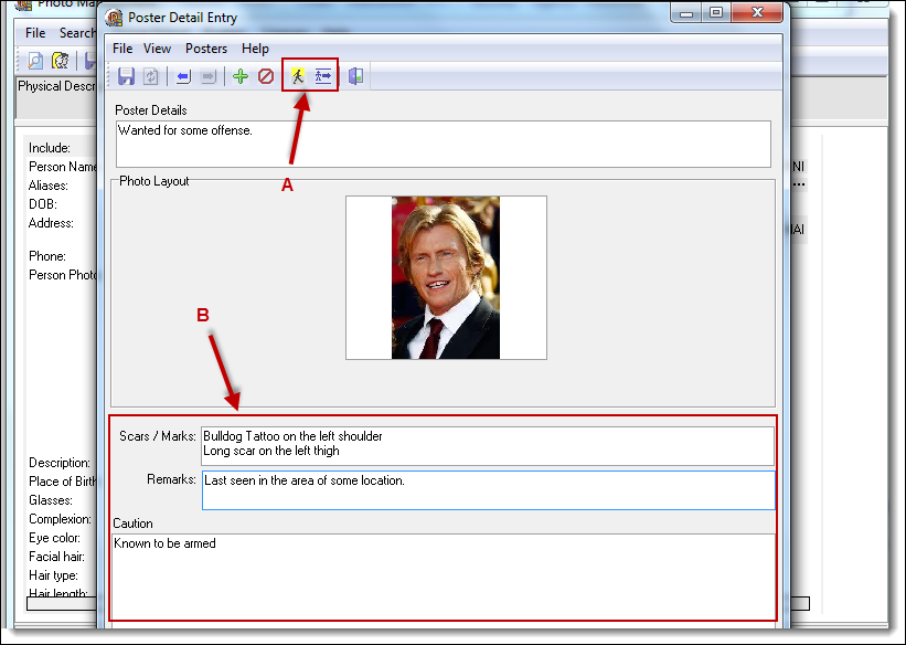 3. There are buttons for Physical Description and Aliases (A) available from the toolbar. These buttons contain information regarding details about the person and can be copied/pasted to the “Scars/Marks”, “Remarks”, and “Caution” sections (B) of the poster.
