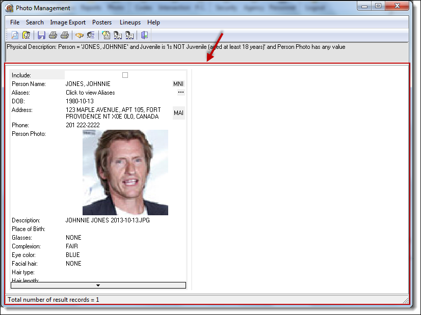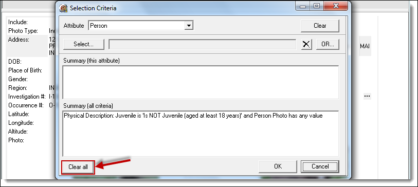 2. The most common way to search for a poster photo is using the “Person” Attribute. By default, any juvenile is excluded from the results. Juveniles are people younger than the adult age defined in the Agency module or a person with no DOB entered. If you wish to include juvenile photos in the search results, click the “Clear All” button prior to entering any search criteria.