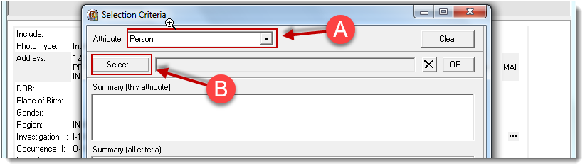 3. For this example, we will use the default search of adult photos only. With the Attribute of “Person” chosen (A), click on the “Select” button (B) to open Person Management.