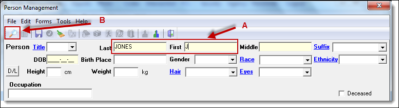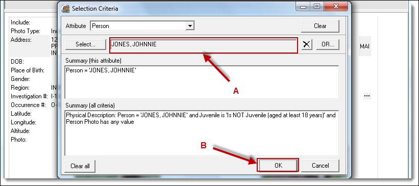 6. The person record is returned to the selection criteria window (A). Click the “OK” button (B) to perform the search.