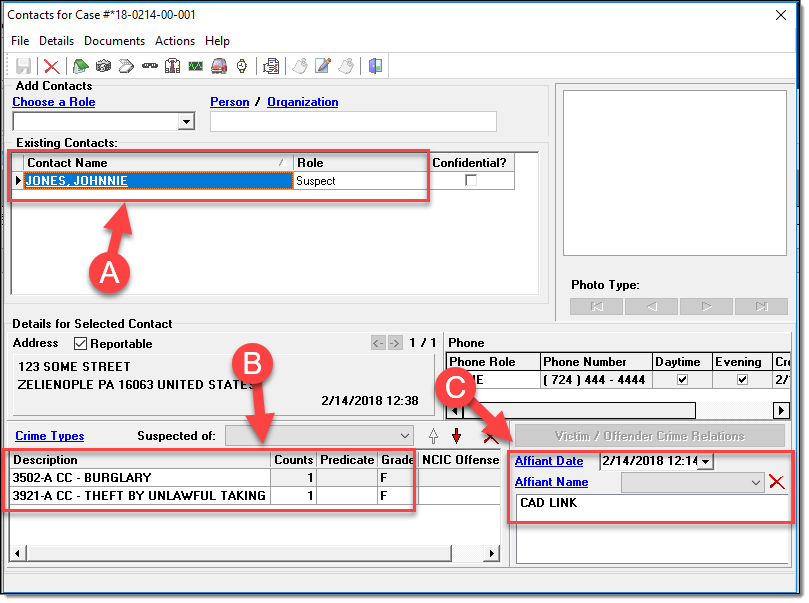 Note: Because the contact has not been arrested, the “Arrested Date/Time” and “Arresting Officer” fields have been changed to “Affiant Date/Time” and “Affiant Name” when the role of SUSPECT is selected.