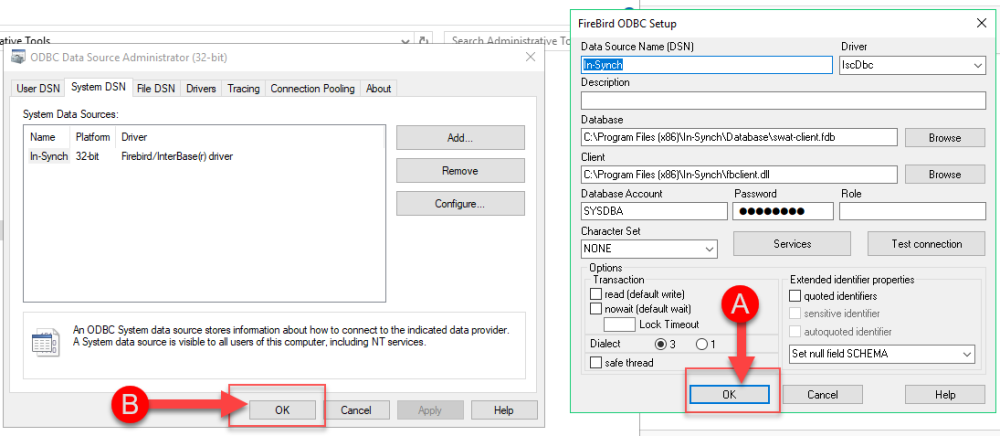 - The path to the fbclient.dll will be added to the “Client” field. Select the “OK” button (A) on the “Firebird ODBC Setup” window and then select the “OK” button (B) on the “ODBC Data Source Administrator (32-bit)” window to save the changes.
