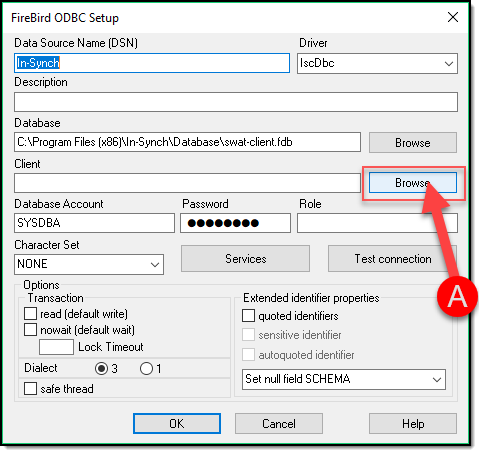 - From the “Firebird ODBC Setup” window, select the “Browse” button (A) located next to the “Client” field.