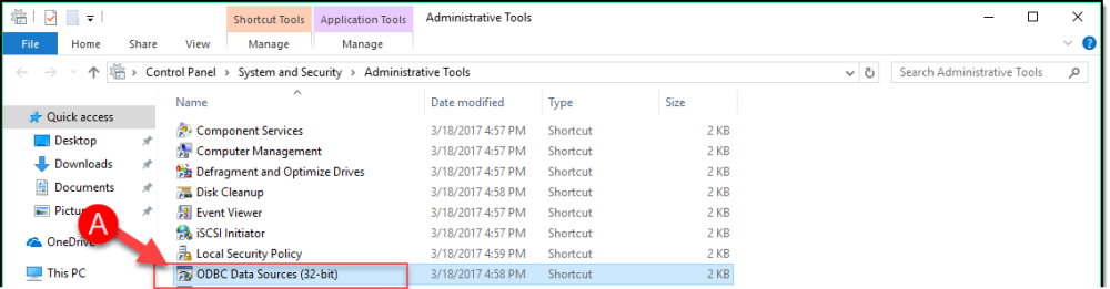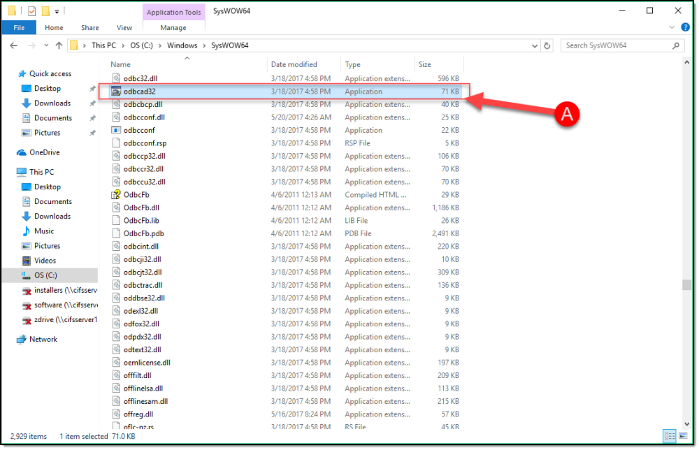 - Through Windows explorer, browse to “C:\Windows\SysWOW64\” and then double-click on “odbcad32” (A).