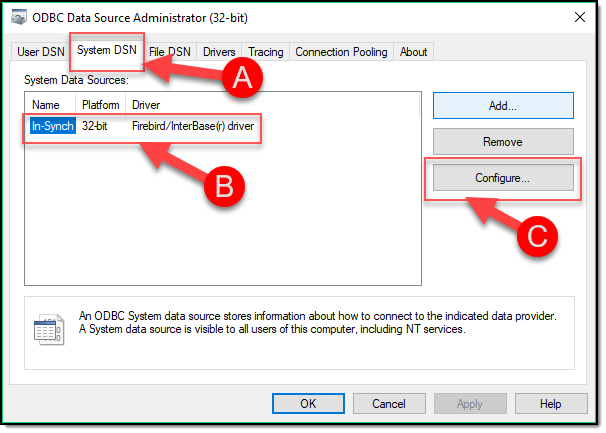 - Select the “System DSN” tab (A), highlight the “In-Synch” listing (B), and then select the “Configure” button ( C ).