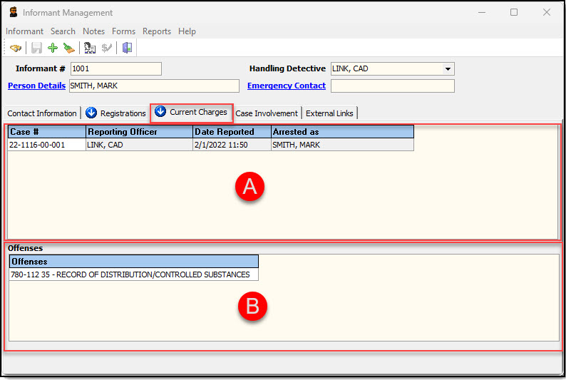 1. The Current Charges tab displays cases in which the confidential informant has been listed as an arrestee and is listed using their person record, not their informant record. The top section (A) displays details of the case, while the bottom section (B) displays any offenses linked to the case.