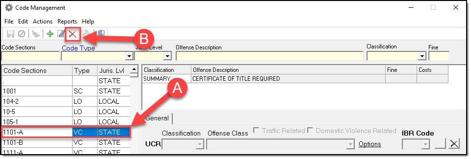 1. If an offense needs to be removed from the Code Management module, highlight the section in the offense list (A), and then click the “Delete” button (B).