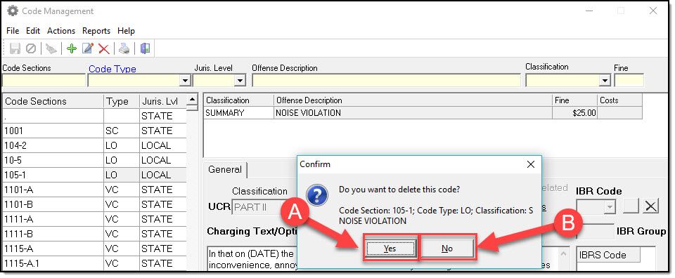 2. Select “Yes” (A) from the Confirmation window to delete the selected offense. Select “No” (B) if you do not wish to delete the selected offense.