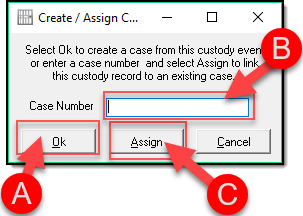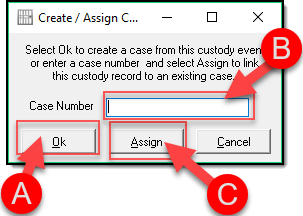 You now have 2 options, you can click OK (A) and create a new Case off of this record or you can type an existing case number in (B) and click Assign ( C ) to assign this record to it.