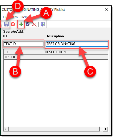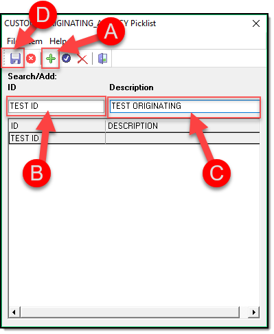 Click Add (A), enter an ID (B), enter a Description ( C ) (this is what will show in the drop down list), and click Save (D). This can be repeated for as many listings as you need for your agency.