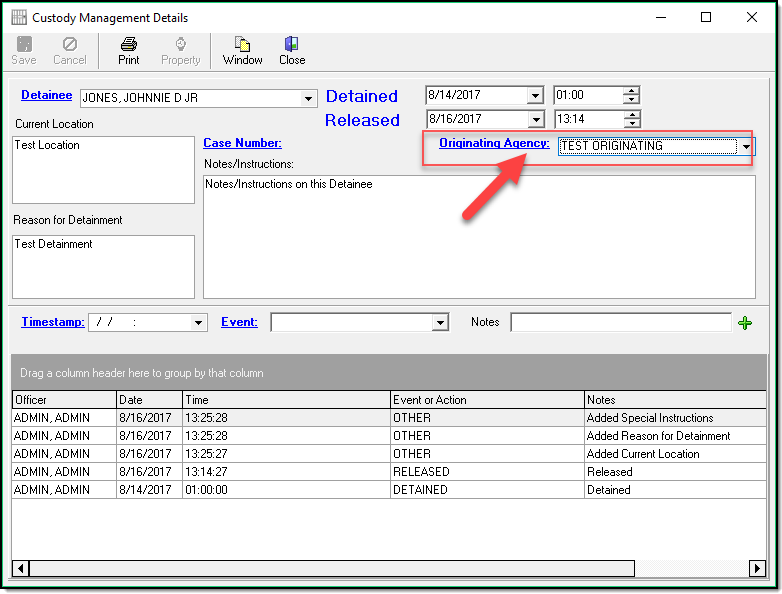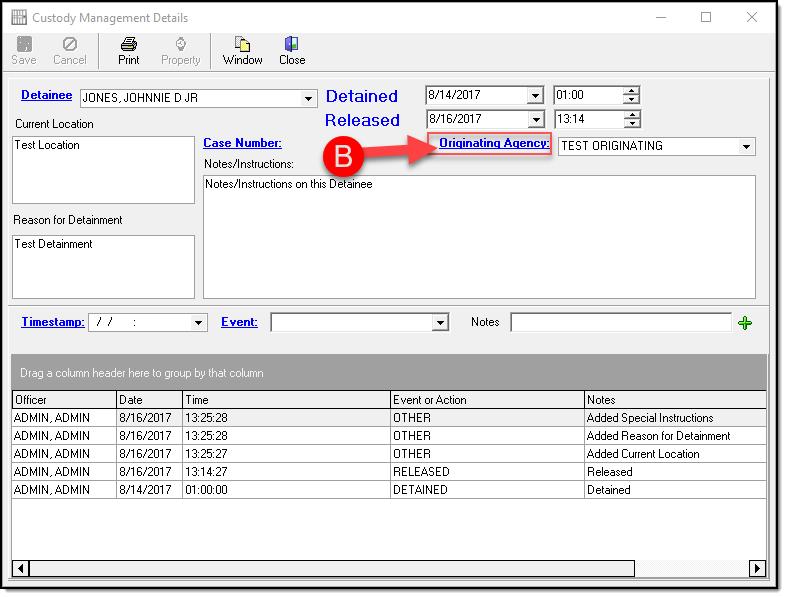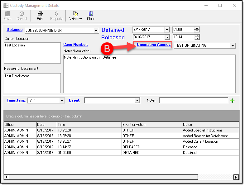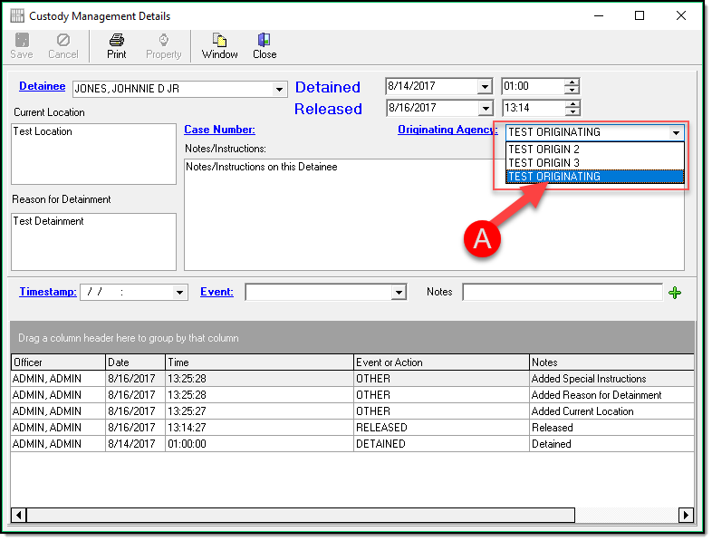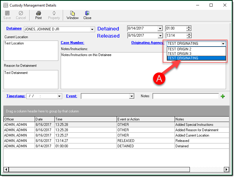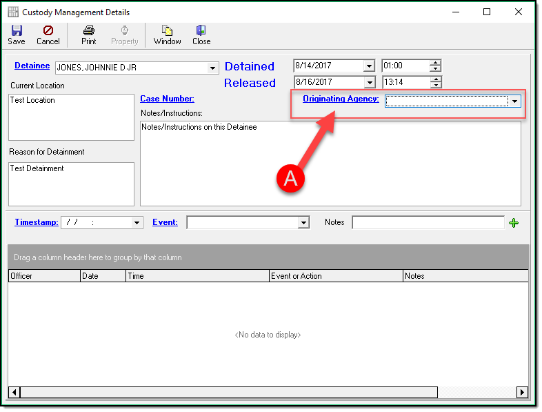 Once you have entered your Detainee, Detainee dates/times, location, reason, notes, and originating agency it is now time to ‘Save’ (A).