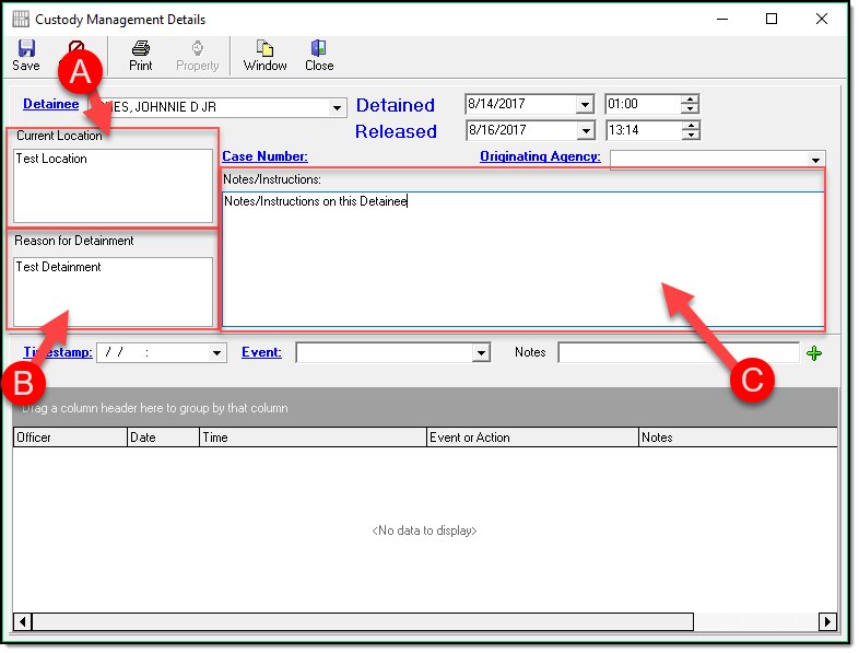 You will now need to enter the Detainee’s Current Location (A), the reason for Detainment (B), and any notes/instructions ( C ) relevant to the detainee or his detainment. These are all free text fields so you can type directly into them.