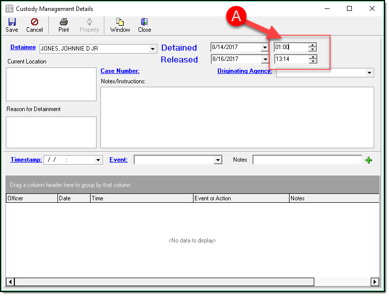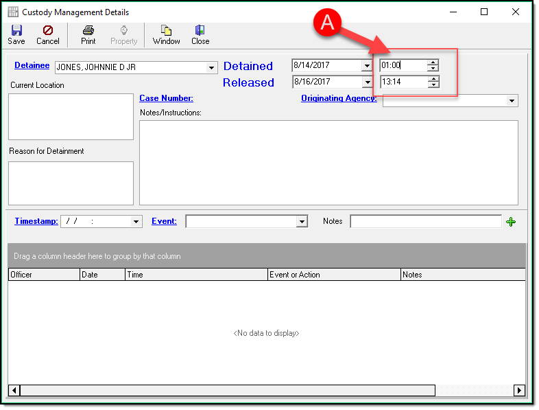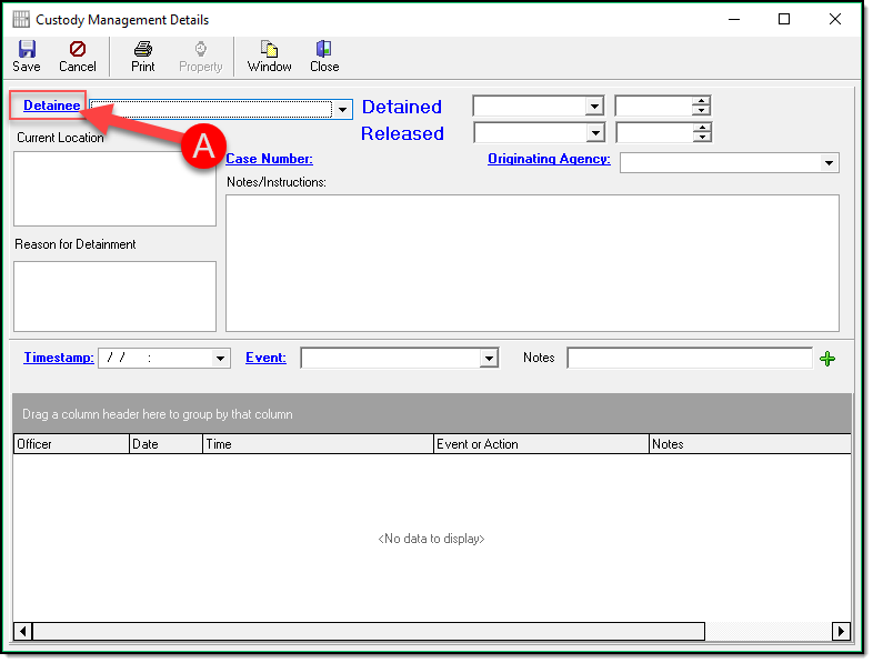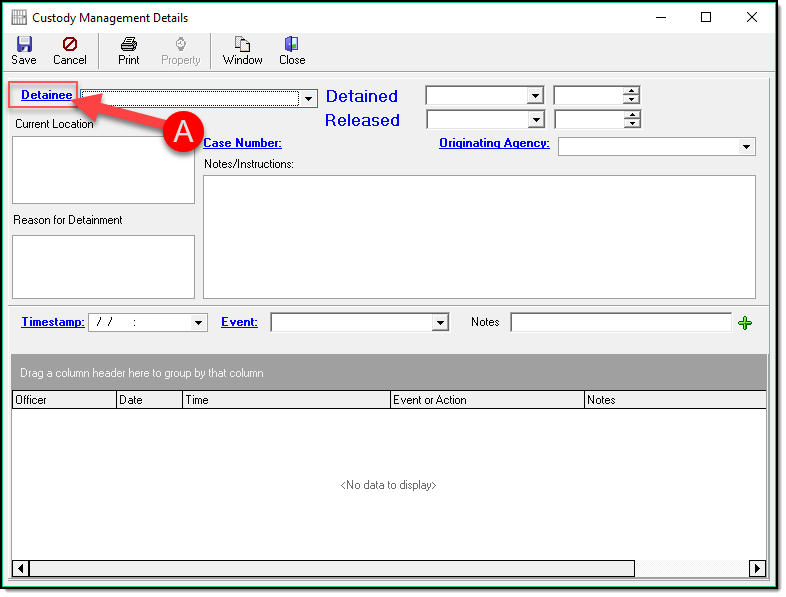 Click the blue hyperlink ‘Detainee’ (A) to add a person as a detainee. You can follow the steps in our Searching and Entering a Person section if you are not familiar with searching and choosing a person.