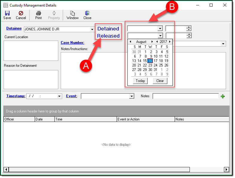 By clicking blue words Detained or Released (A) will enter the current date and time in the box. If you need to enter a different date you can use the drop-down box (B) beside either that will provide a calendar you can choose the appropriate date from.