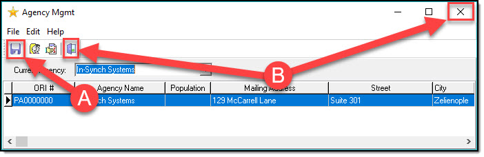 If you have made any changes, remember to Save them on the main Agency Management screen (A). Then exit the Agency Management module when you are ready (B).