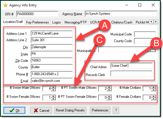 On the Agency Info Entry, you can edit the agency address, phone number, and email (A). You can fill in the Chief Admin, and the Records Clerk (B). Finally, you can adjust the amount of full time, part time, and civilian staff you have ( C ). When you are finished, press the OK button.