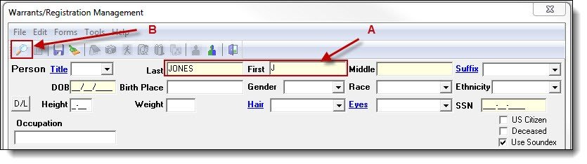 1. Enter part of the person’s last name, first name or both (A), and then click the “Search” button (B).