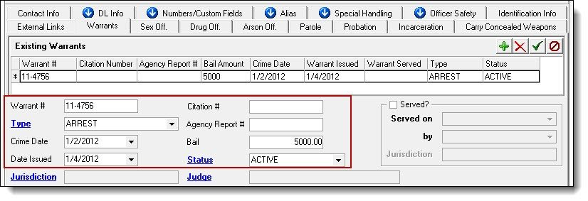 4. Enter any known information into the following fields: Warrant Number, Type, Crime Date, Date Issued, Citation #, Agency Report #, Bail, and Status.