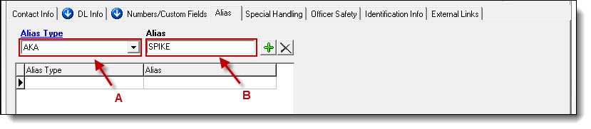 2. Select “AKA” from the Alias Type drop down list (A),and then enter the person’s alias into the Alias field (B).