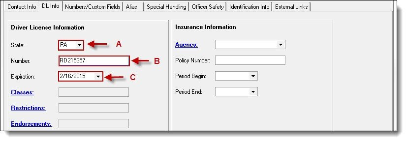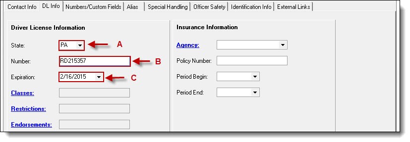 2. Select the State (A) from the drop down list, enter the License Number (B), and select the Expiration date ( C ).
