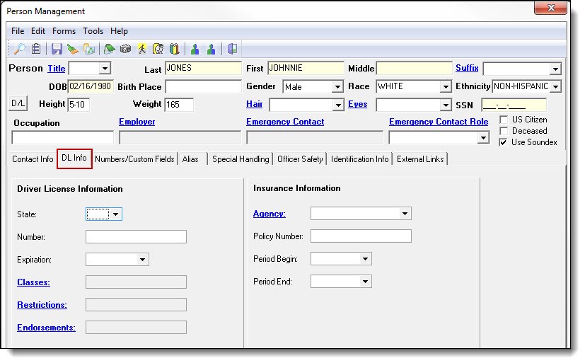 Classes, Restrictions, and Endorsement can be entered by clicking on the blue word for each entry. Not all states will have available information under these fields.