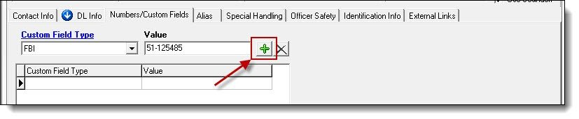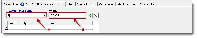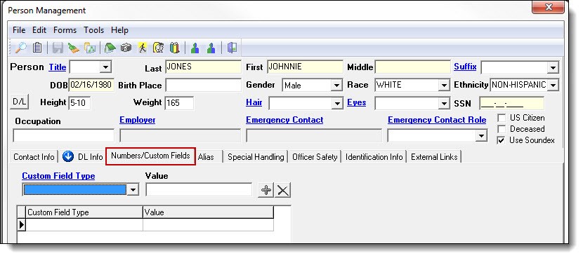 - The Numbers/Custom Fields tab is useful for entering information like additional DOB’s, additional SSN’s, FBI numbers, SID numbers, or any other custom field/number that your agency tracks.
