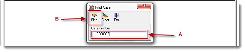 2. Enter the case number (A), then click the “Find” button (B).