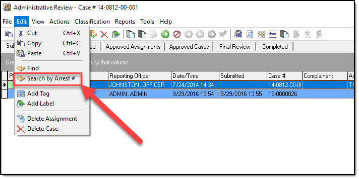 1. Cases can also be found by Arrest number. To start, use the Edit pull-down option, and select ‘Search by Arrest #’.