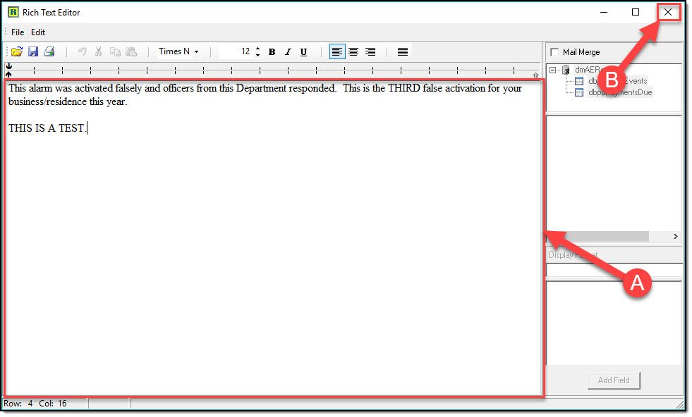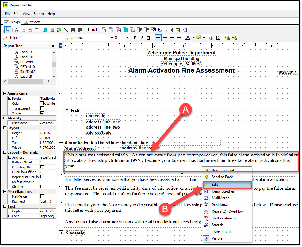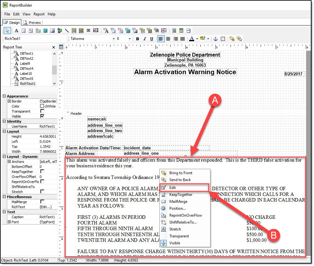 3. To edit the main body of the Warning letter, select the text field (A), then right-click to bring up the context menu, and select edit (B).