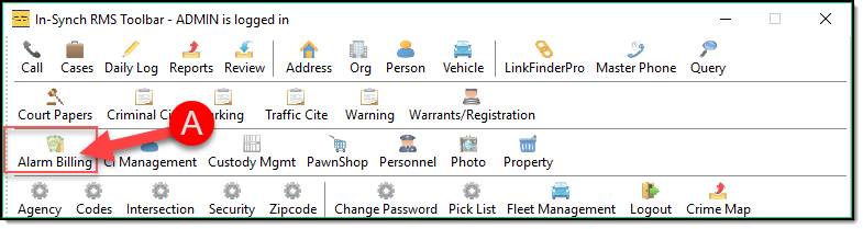 To Open click the Alarm Billing Icon (A) on the main RMS toolbar.