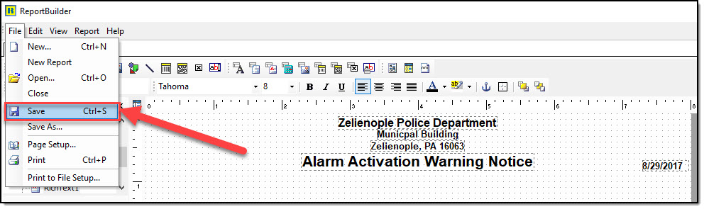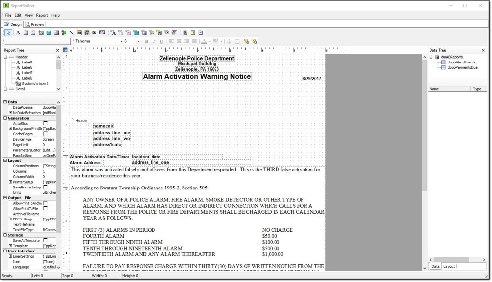 2. This opens the ReportBuilder in Design mode. Some of these fields pull data from the database, others are static, and can be edited.