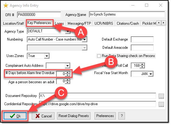 3. On the Agency Info Entry form, select the Key Preferences tab (A), and then either type or use the arrows to set the ‘# Days before Alarm fine Overdue’ (B). When finished, press the Ok button (C.).