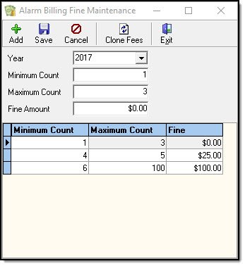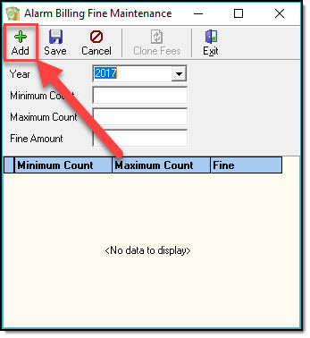 2. With Alarm Billing Fine Maintenance open, press the Add button.