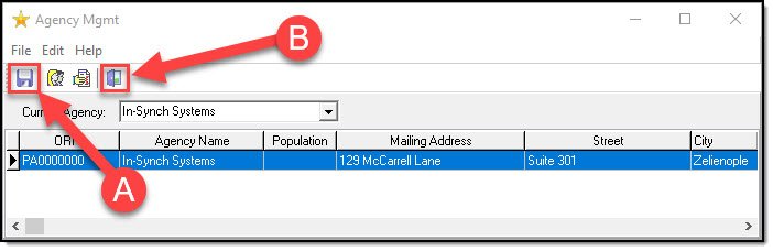 4. On the Agency Management screen, press the Save button to save the changes (A), and then exit the module with the Exit button (B).