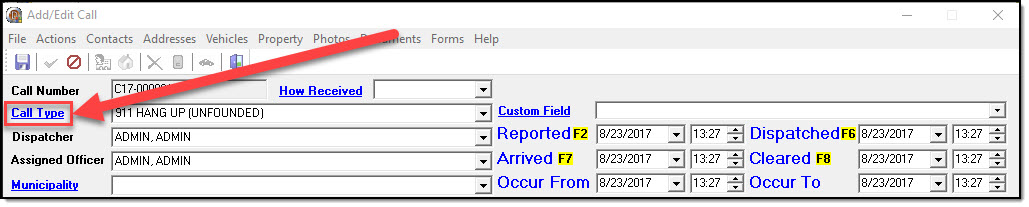 3. Click the blue hyperlink for Call Type, to open the Call Type Management window.