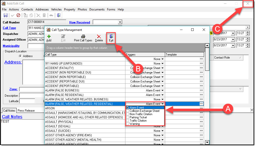 5. In the Trigger field, use the Drop Down list to check Alarm Event (A), then close Call Type Management (B), and the Add/Edit call window (C.).