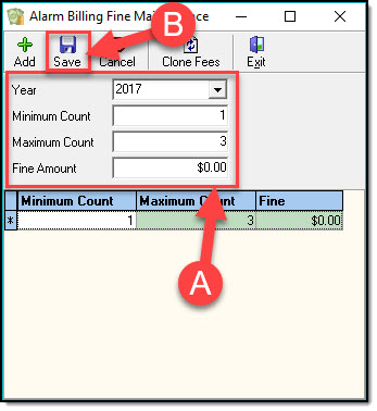 3. Select the year (it defaults to the current year), the minimum count, maximum count, and the fine for that level (A), and then press the Save button (B).