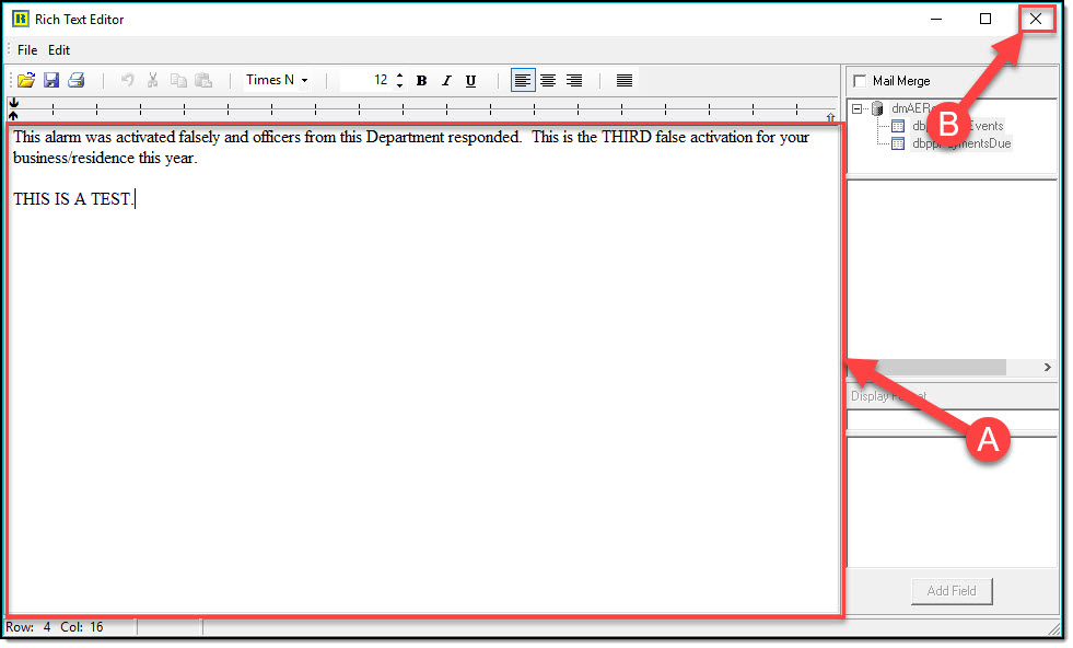 4. This opens the Rich Text Editor. Edit the text (A), and then press the exit button (B). On the pop-up window, say ‘Yes’ to save your changes.