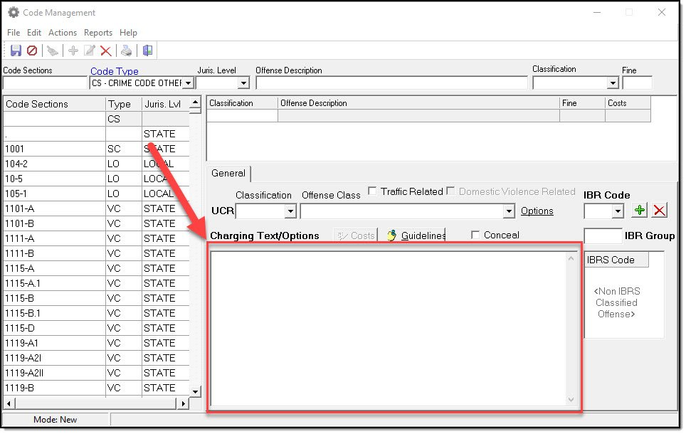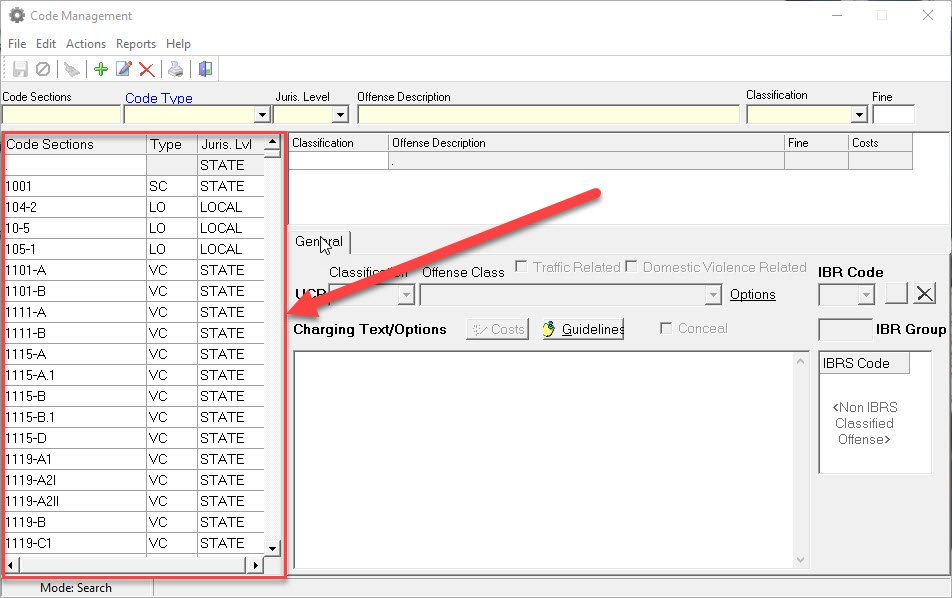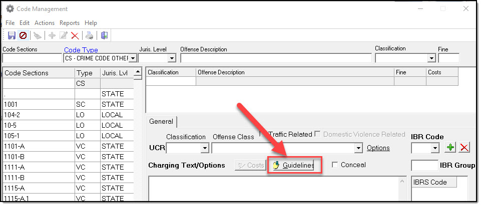 6. The entire body of the applicable law can be added in the Code Management module of the In-Synch RMS as a source of reference. To add the entire law or any portion thereof to an offense, click on the “Guidelines” button to open the Charging Guidelines window.
