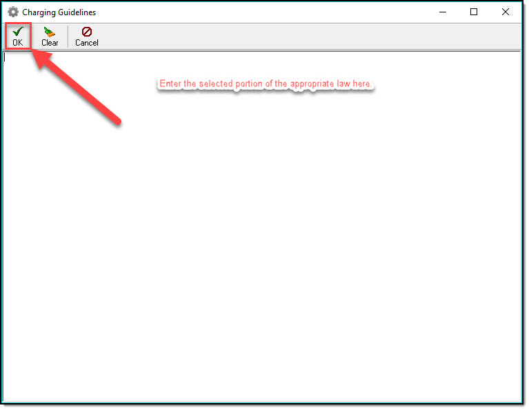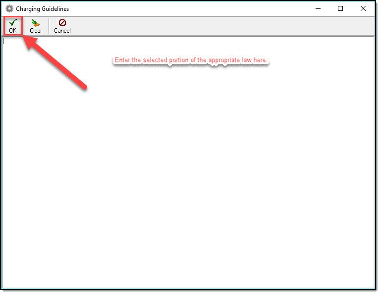 7. Enter the applicable law or the portion pertaining to the selected offense into the Charging Guidelines window by typing it directly into the provided space or by copying it from another source and pasting it into the window. After the guidelines have been entered click the “OK” button and the window will close and save the entry.