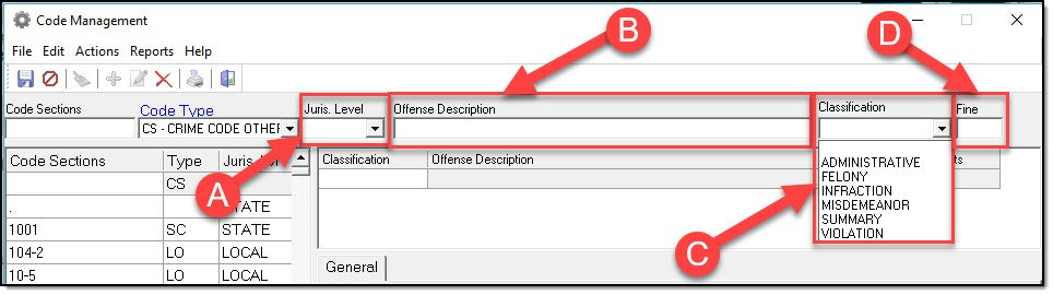 4. Choose the appropriate Jurisdiction Level from the “Juris. Level” dropdown box (A), enter a description of the offense by typing it into the “Offense Description” box (B) and then select the appropriate Classification from the “Classification” drop-down box ( C ). If the fine for a particular code is constant, the value can be entered into the “Fine” box (D).