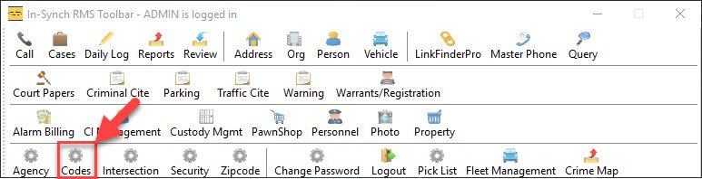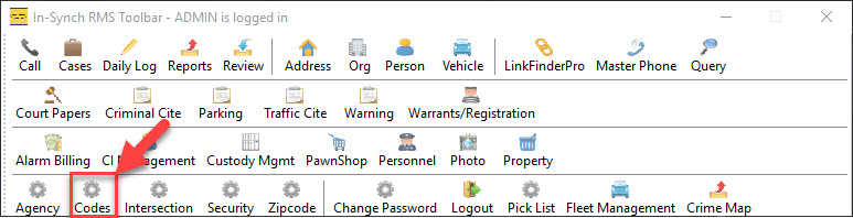 This guide is designed to show the most common functions of the Code Management Module in the In-Synch RMS. The Code Management module allows system administrators to Add, Edit or Delete offenses that are used in throughout the RMS. The Codes Management module can be accessed by clicking the “Codes” button located on the main Toolbar.