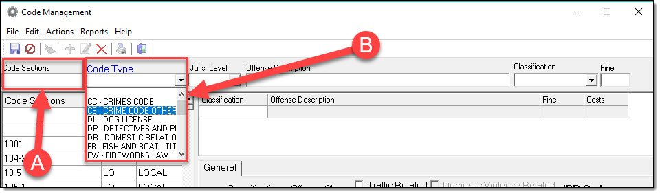 3. Enter the Offense Section (A), and then select a Code Type (B).