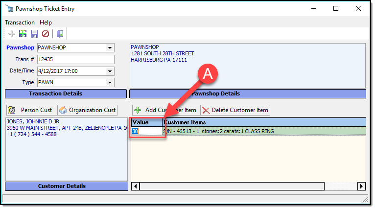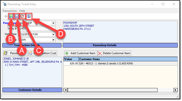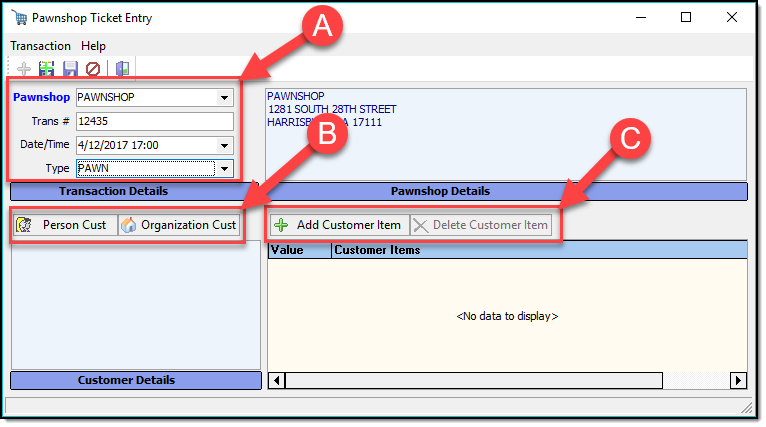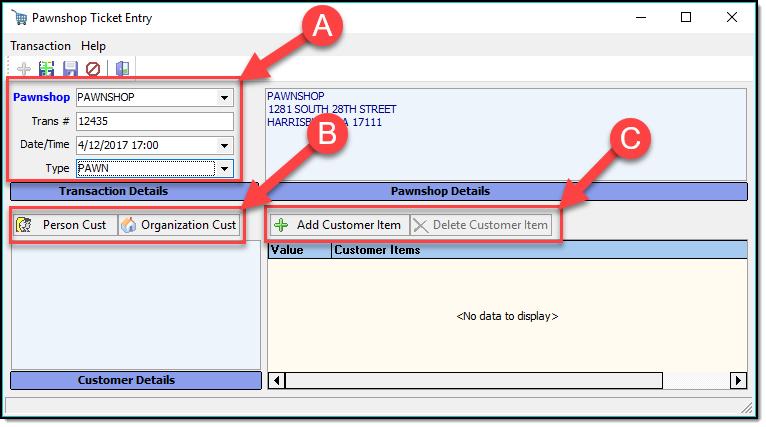 Select the name of the pawn shop from the drop down list, then fill in the Trans #, Date/Time, and Type of transaction (A). Use the Customer buttons to search/add the customer information to the pawn ticket (B). Use the Customer Item buttons to add, or remove items from the pawn ticket ( C ).